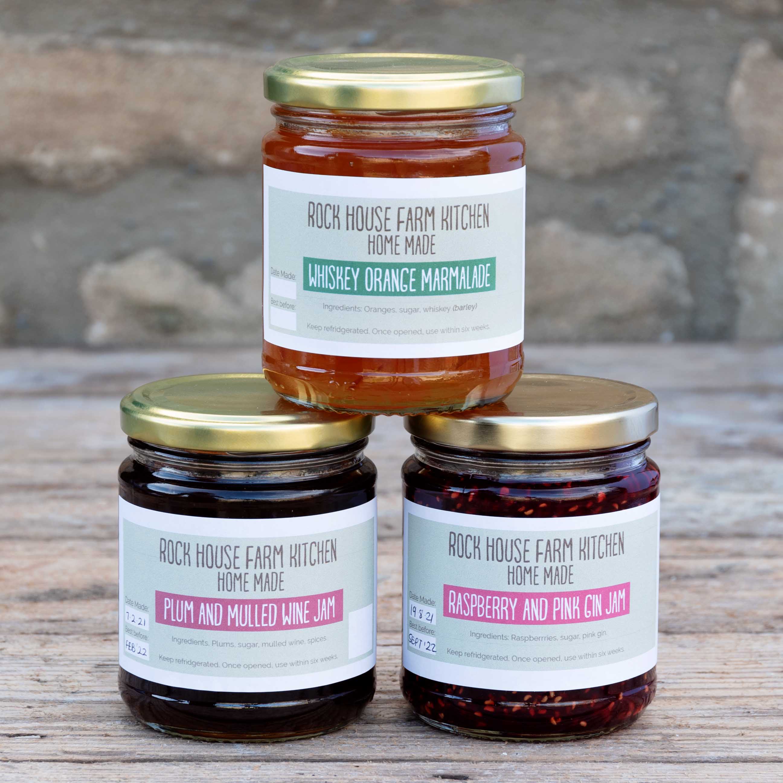 Whiskey Orange Marmalade, Raspberry and Pink Gin Jam, Plum and Mulled Wine Jam – £3.50